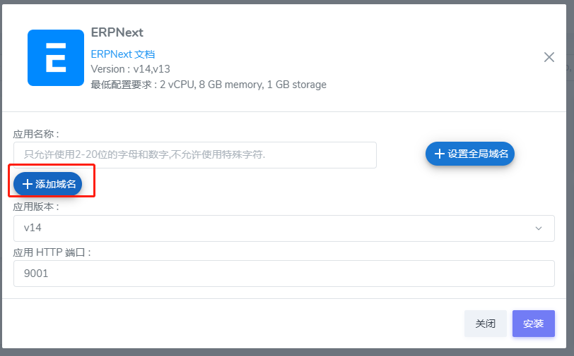 2. 进入应用的 安装 界面后,点击 +添加域名 按钮,填写解析的子域名,例如:erpnext.websoft9.cn