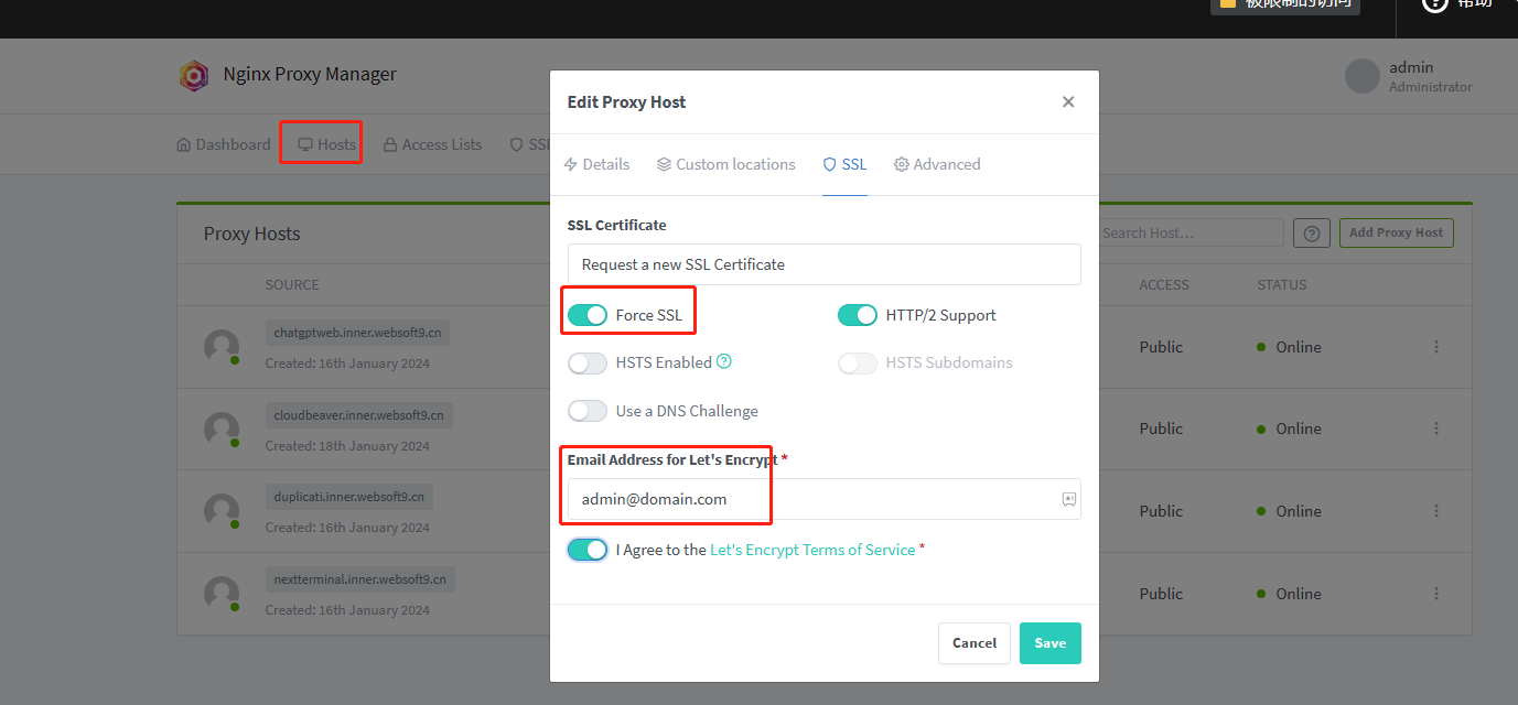 2. Edit the target application Proxy Host, open the SSL tab and checkmark Force SSL