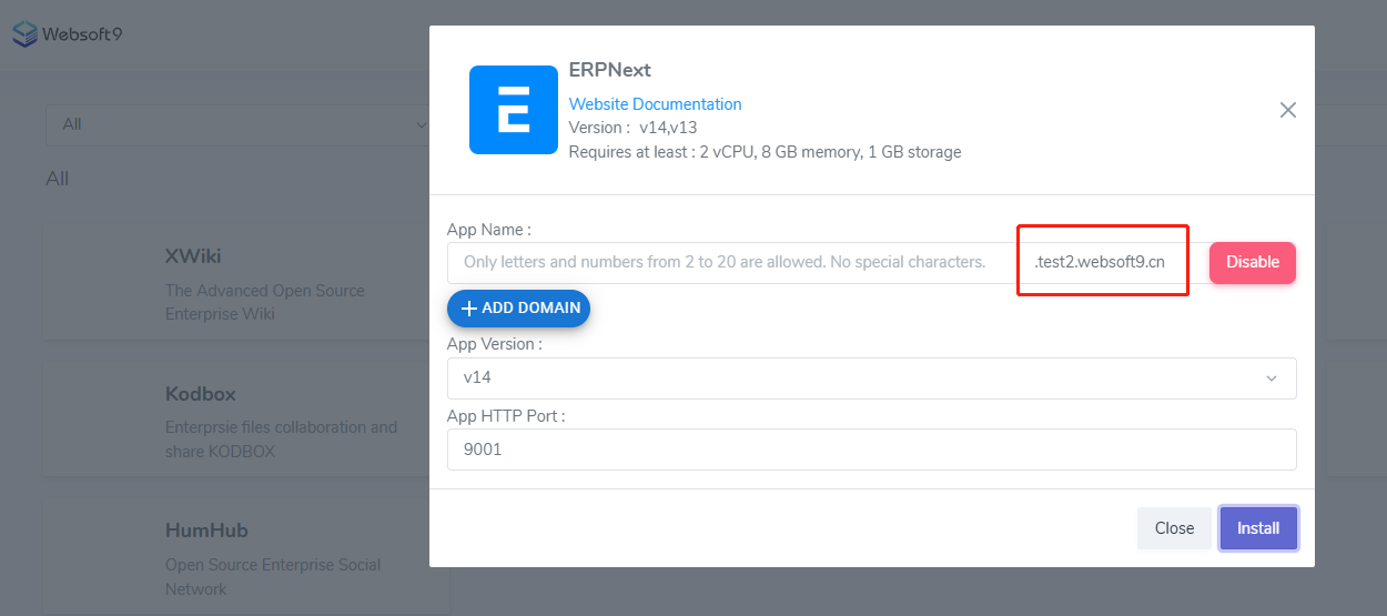 2. Go to Install interface and click +ADD DOMAIN button to add your domain like erpnext.websoft9.cn