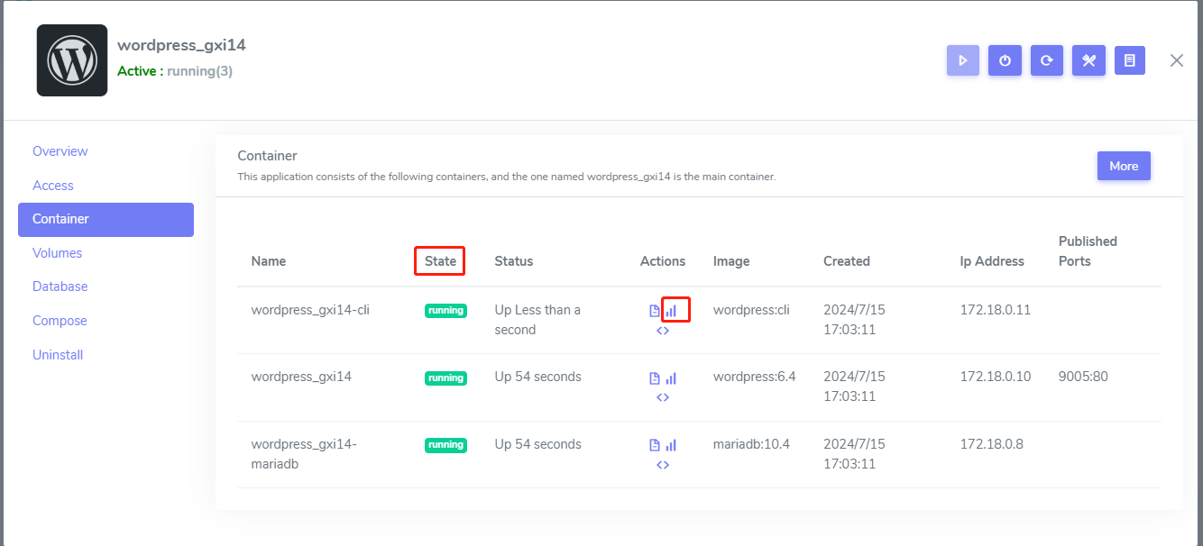 Websoft9 Console provide monitoring for your WordPress, includes services status, CPU/Memory usage.